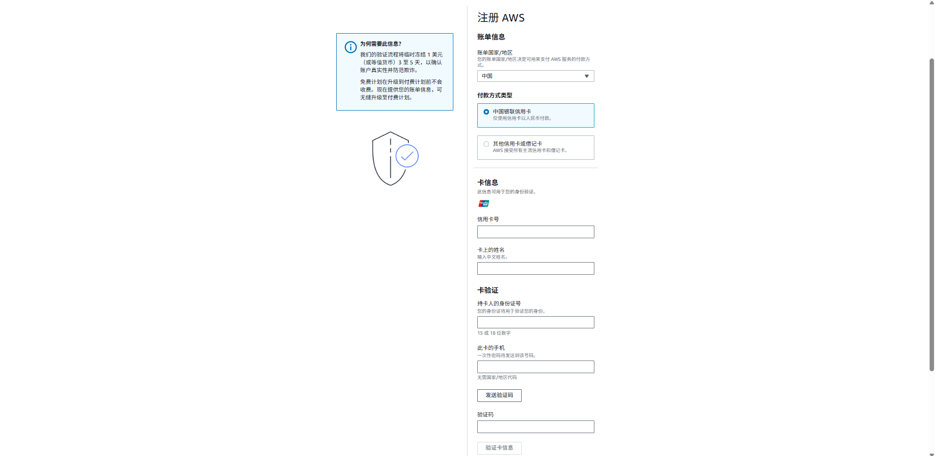 AWS 的注册逻辑是:先验证身份 → 再验证支付方式 → 再开启服务权限